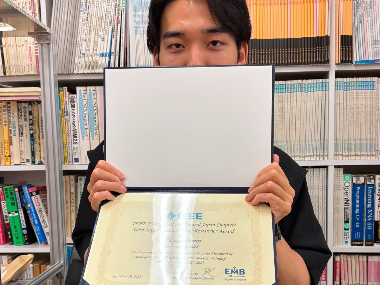 学生の成果 2025.09.30 玉井 隼さん(ヒューマニクス2年生)が EMBC2025若手研究者対象論文コンペティションにおいてIEEE EMBS East and Central Japan Chapter/West Japan Chapter Young Researcher Awardを受賞しました。 タイトル:Development of Supine-Use Wearable Cyborg for Treatment of Neurogenic Bowel Dysfunction after Spinal Cord Injury 著者:Hayato Tamai, Akira Uehara, Yoshiyuki Sankai, Hiromasa Hara, and Hiroaki Kawamoto [玉井 隼さんからのメッセージ]I really appreciate being selected. This opportunity means a lot to me, and I’ll continue working hard on my research activities. LINK Next